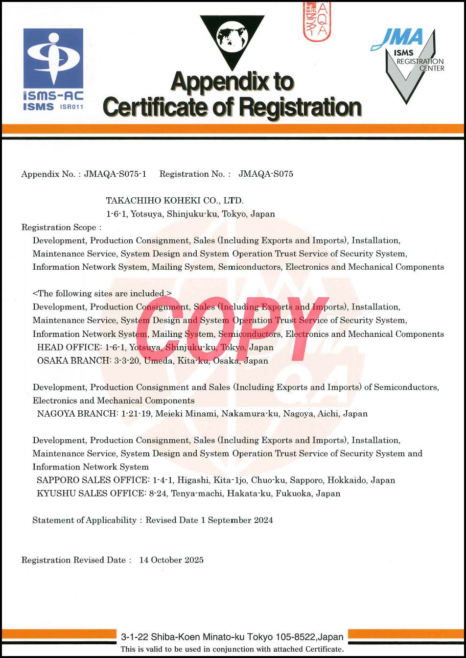 - Development, Production Consignment, Sales (including exports and imports), Installation, Maintenance Service, System Design and System Operation, Trust Service of Security System and Information Network System