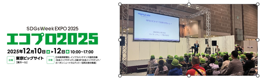 高千穂交易株式会社(本社:東京都新宿区、代表取締役社長:井出尊信、証券コード:2676)の連結子会社で、自鳴式防犯システムとRFIDシステムを展開するマイティキューブ株式会社(本社:東京都新宿区、代表取締役社長:本川勝広、以下「マイティキューブ」)は、12月10日~12日に東京ビックサイトで開催された 『SDGs Week Expo 2025 「エコプロ2025」 』 にてエコプロ公開授業を行いましたことをお知らせします。