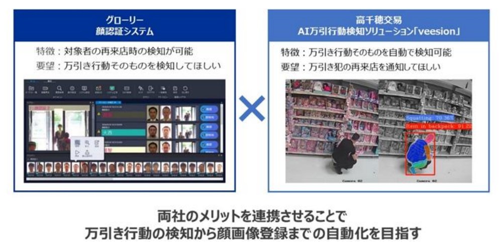 高千穂交易株式会社(本社:東京都新宿区、代表取締役社長:井出尊信、証券コード:2676、以下「当社」)とグローリー株式会社(代表取締役社長:原田 明浩、以下 グローリー)は、両社事業の拡大を目指し、高千穂交易の AI 万引き行動検知ソリューション「veesion(※1)」と、グローリーの顔認証システムを連携させた新たな小売店舗向けソリューションの実証実験を国内某大手ショッピングセンターで 2026 年 4 月1日より開始します。